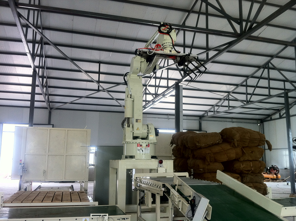 碼垛機器人是由全伺服控制的碼垛機,所有動作均由內部伺服控制器來控制完成,無需由光電及位置傳感器發出信號,杜絕了粉塵及人為對碼垛設備的影響。機械手碼垛機堆碼具有體積小、靈活性高、可靠性高  、精度高(可達毫米級)等優點。